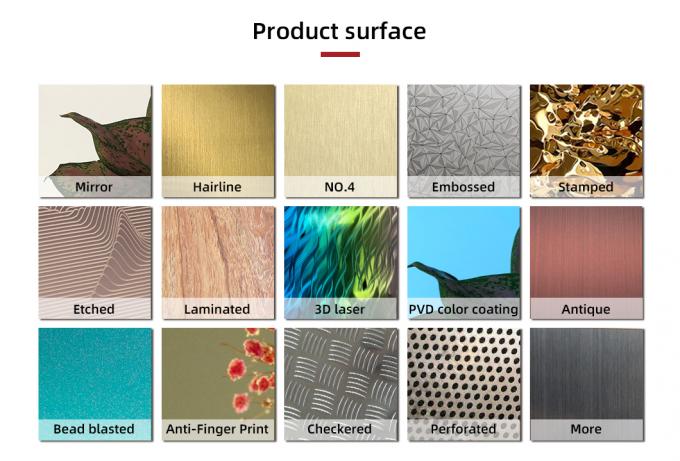 Разносторонние поверхностные финиши: листы нержавеющей стали Анти--отпечатка пальцев предлагают разнообразие поверхностные финиши, включая зеркало, почищенное щеткой, и pearlescent влияния, для того чтобы поставить еду к различным потребностям дизайна. Эти финиши передавают уникальные текстуры и возникновения, делающ их идеальным для внутреннего и внешнего дизайна.