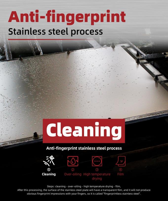 Технология Анти--отпечатка пальцев: листы нержавеющей стали Анти--отпечатка пальцев используют предварительные методы поверхностного покрытия для обеспечения ровной поверхности которая устойчива к отпечаткам пальцев и пятнам воды. Это делает их идеальной для зон высоко-движения как кухни и bathrooms, по мере того как они остаются чистыми и уточненными.
