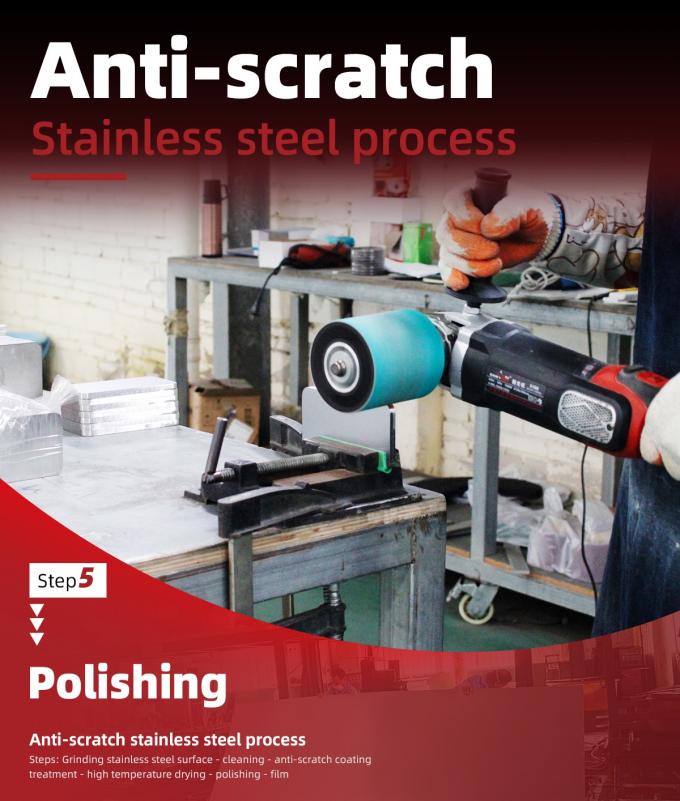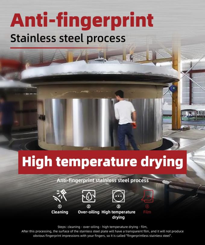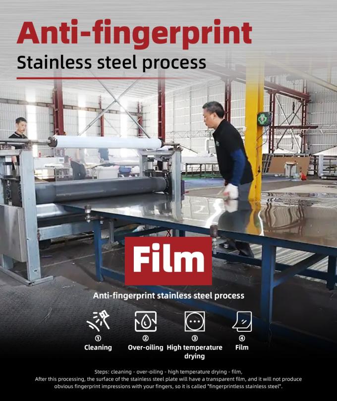 4Последний этап - нанесение пленки.В процессе нанесения пленки на поверхность нержавеющей стали образуется прозрачная защитная пленка, придающая ей свойства противозагрязнения и устойчивости к царапинам.Это также ключ к эффекту "без отпечатков пальцев", обеспечивая, чтобы продукт не оставил за собой заметных отпечатков пальцев во время использования.